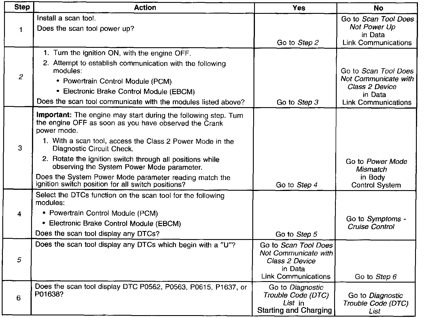 The Diagnostic System Check directs the service technician to the next logical step in diagnosing the concern. understanding the system, the table, and using it correctly reduces diagnostic time and prevents misdiagnosis. For a review of the cruise control system, refer to Cruise Control Description and Operation.