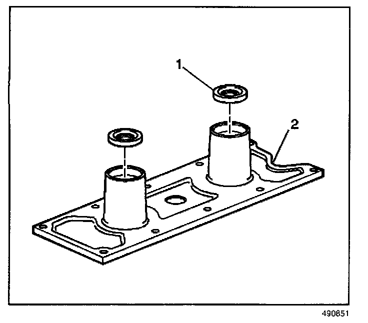 2. Install the knock sensor oil seals (1) into the engine valley cover (2).