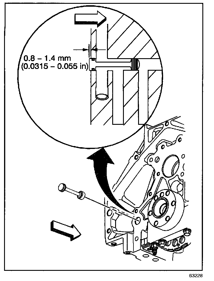 15. Install a NEW engine block front oil gallery plug, if required. Install the front oil gallery plug into the oil gallery bore 2.2-2.8 mm (0.0086-0.011 in) below flush.
