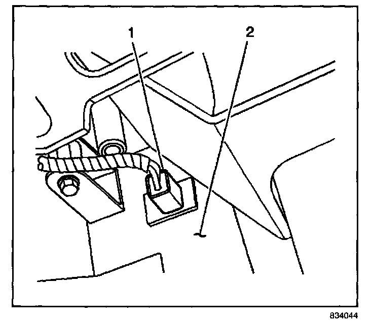 1. Install the lower left air temperature sensor (1) to the HVAC module (2).