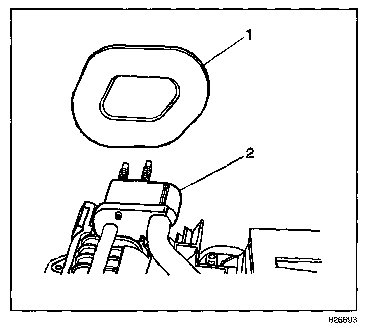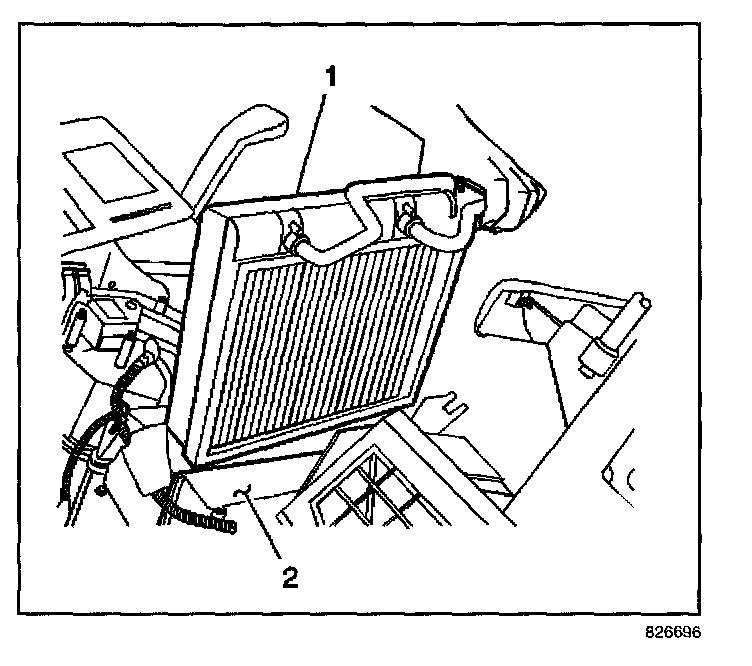 1. Install the evaporator core (1) to the HVAC module (2).