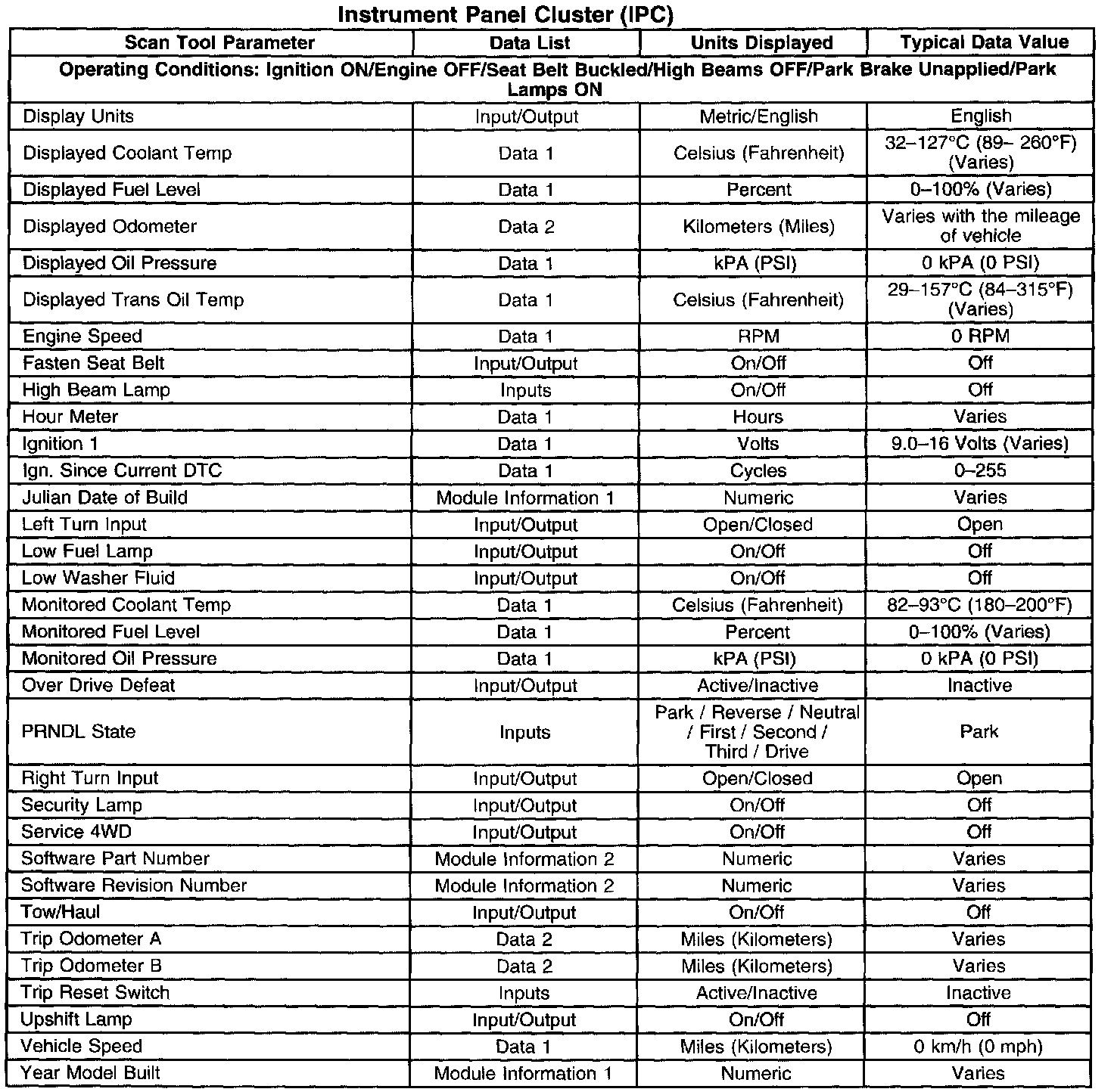 Scan Tool Data List - Instrument Panel Cluster (IPC) Part 2: