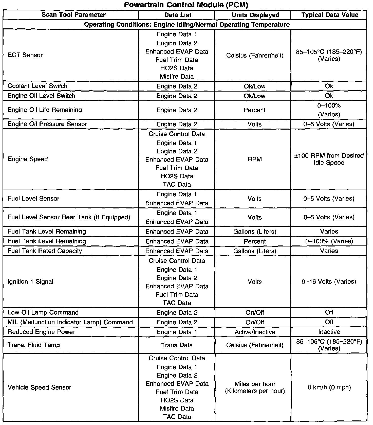 Scan Tool Data List - Powertrain Control Module (PCM):