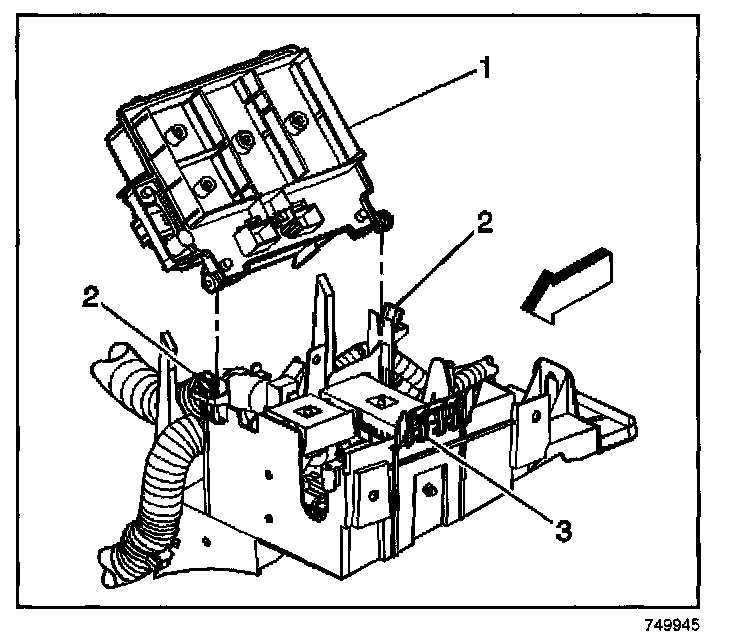 8. Push on the tabs (2) in order to lift the electrical center (1) out of the housing.