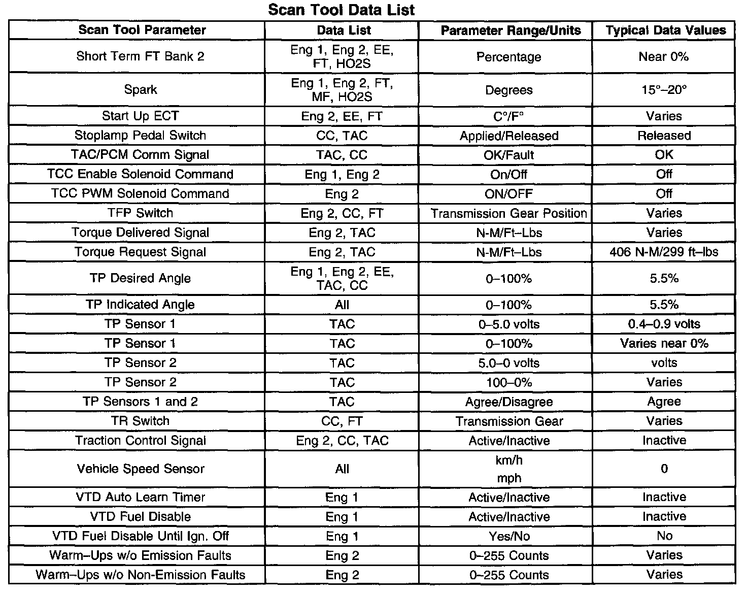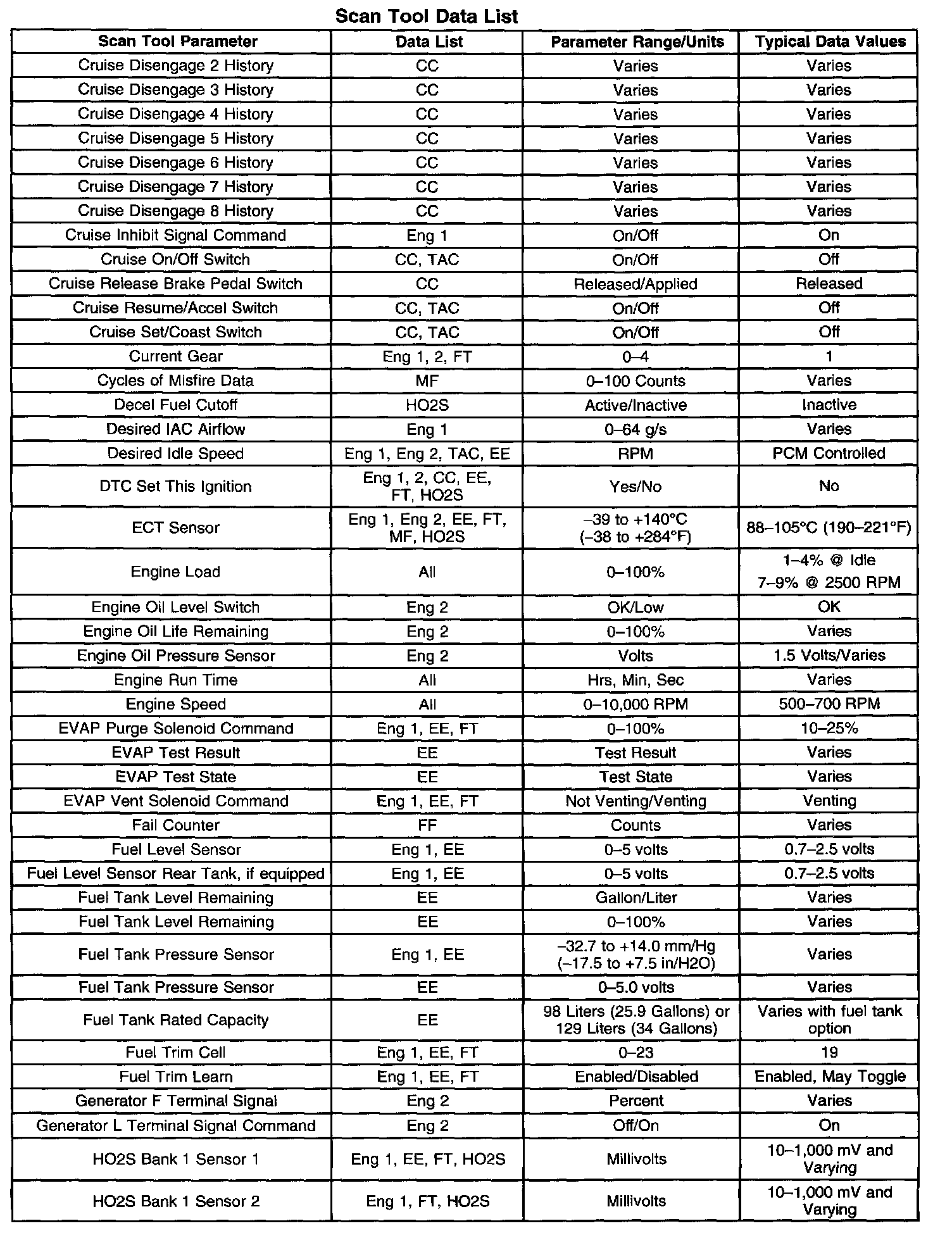 SCAN TOOL DATA LISTThe Engine Scan Tool Data List contains all engine related parameters that are available on the scan tool. The list is arranged in alphabetical order. A given parameter may appear in any one of the data lists, and in some cases may appear more than once, or in more than one data list in order to group certain related parameters together.