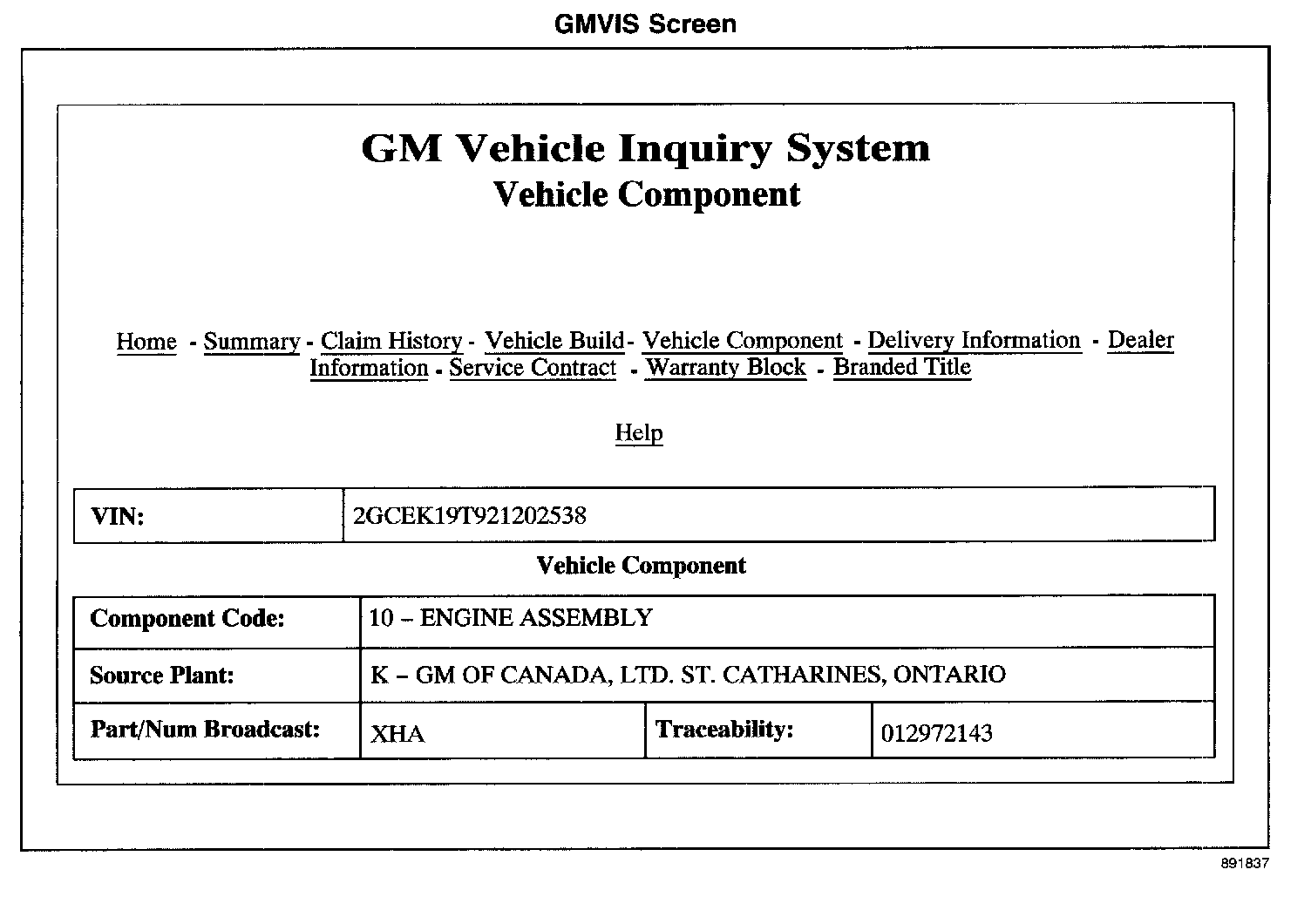 The engine bar code tag is usually in one of several places. The bar code tag could be on a rocker arm cover, the ends of a cylinder head or on the oil pan or the oil rail area of the engine. The information required from the tag is the 3 position alpha-numeric code which identifies the model of the engine and the series of numbers at the bottom of the tag. The number of digits will vary depending on the engine application. All the numbers will be required to process an engine request. If this is the original engine in the vehicle, the engine information is available in GMVIS. Choose the Vehicle Component selection, the 3 position alpha-numeric code is the Part/Num Broadcast section and the Traceability section is the bar code information that is required. It may be easier to use GMVIS to obtain the necessary information; however, it is only valid for the original engine.