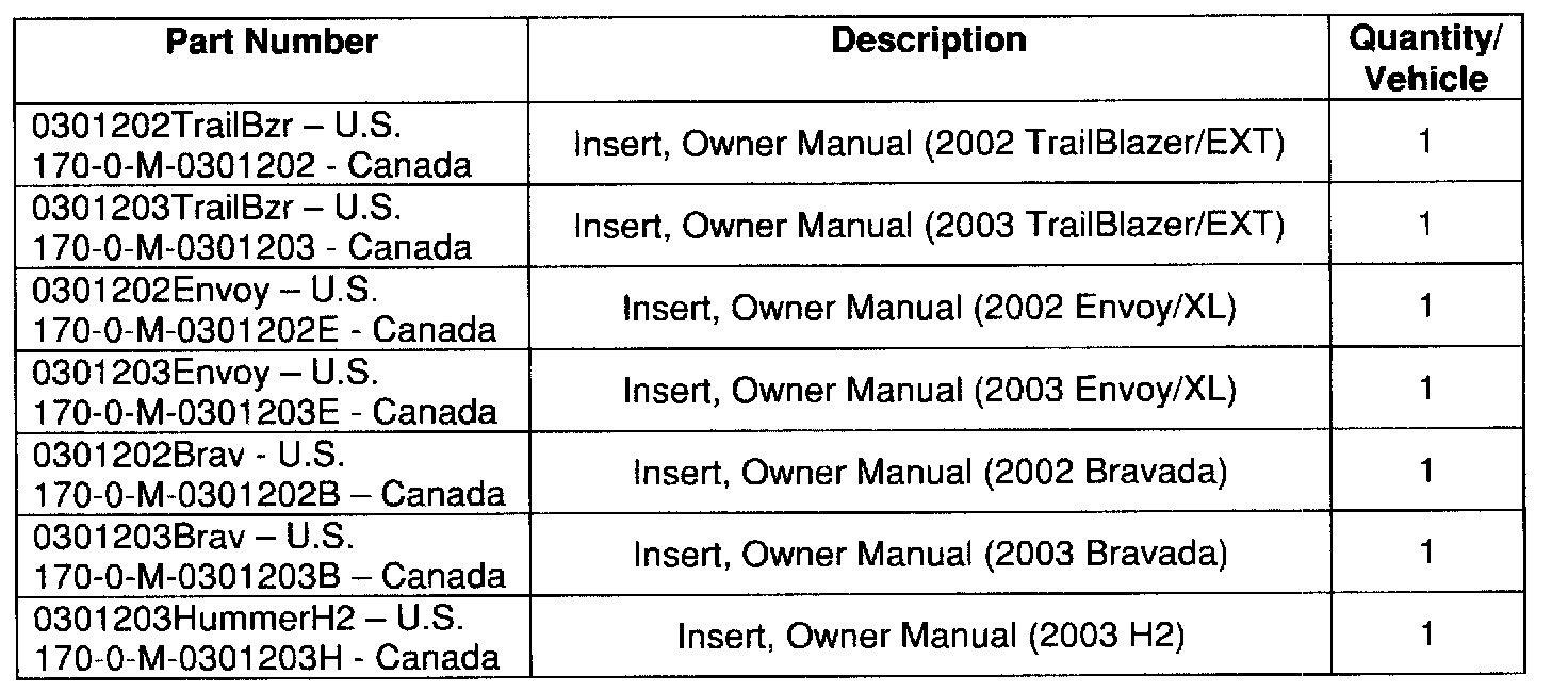 Additional owner manual inserts, if required, are to be obtained from the source shown. DO NOT ORDER OWNER MANUAL INSERTS FROM GMSPO.
