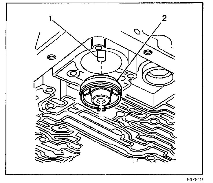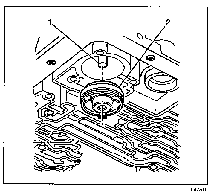 3. Install the 3-4 accumulator piston (2) onto the pin (1) in the transmission case.