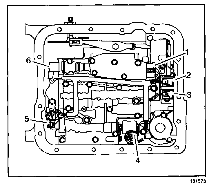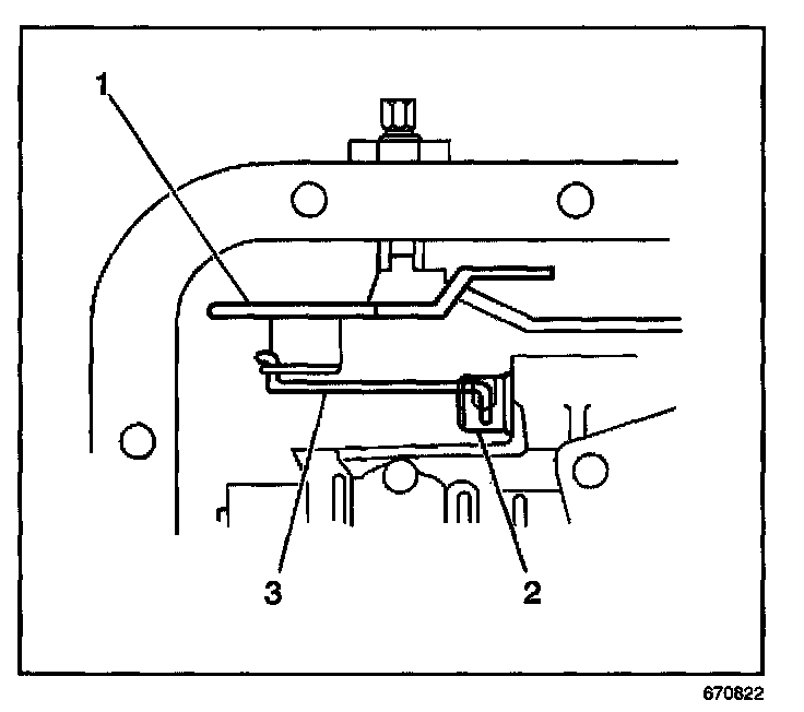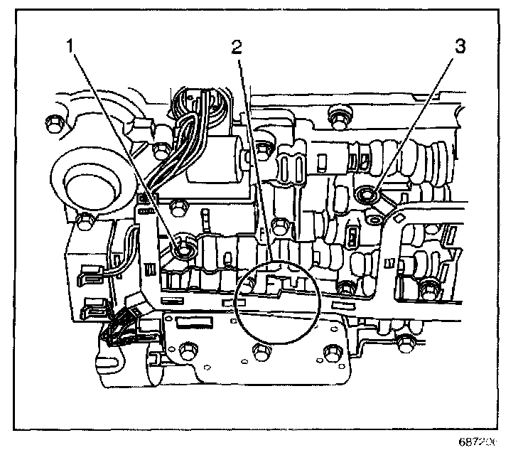 3. Verify that the manual valve link (3) is installed properly to the inside detent lever (1) and the manual valve (2).
