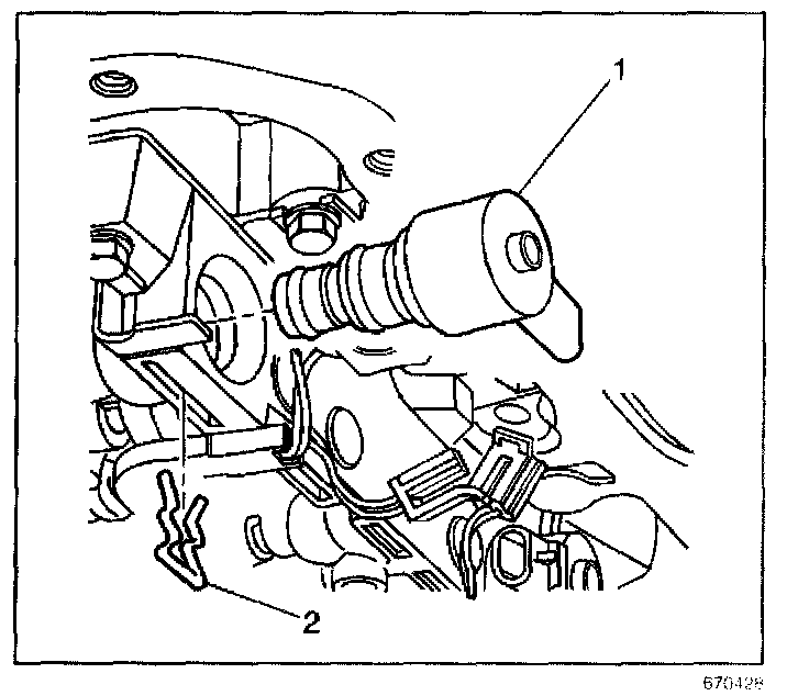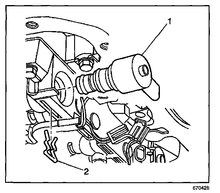 8. Remove the TCC PWM solenoid retainer (2) with a small screwdriver. Rotate the solenoid (1) in the bore, if necessary, until the flat part of the retainer (2) is visible.