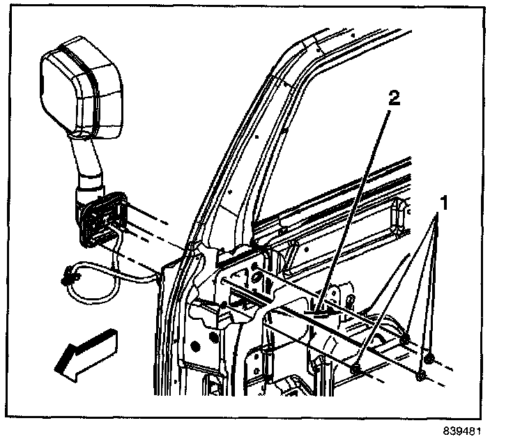 4. Remove the fasteners (1) retaining the mirror to the door.