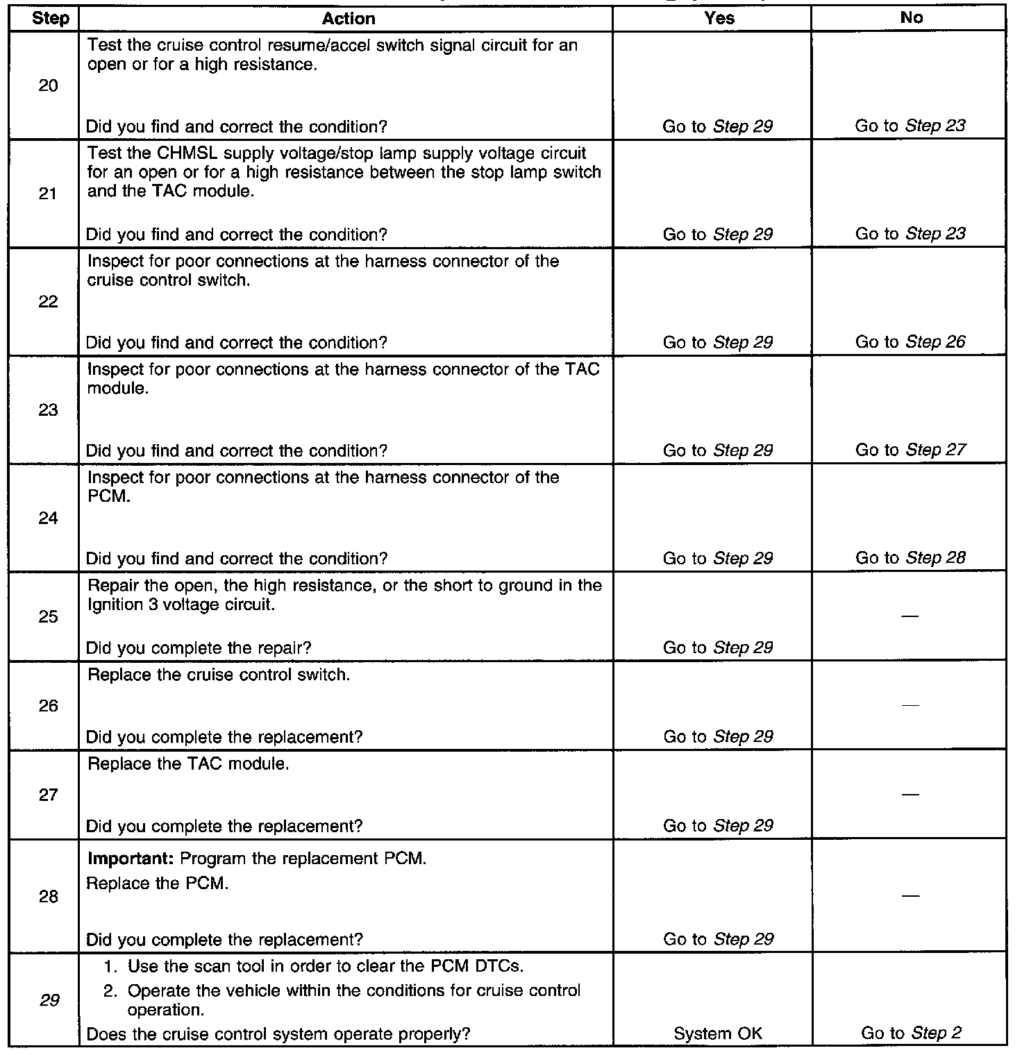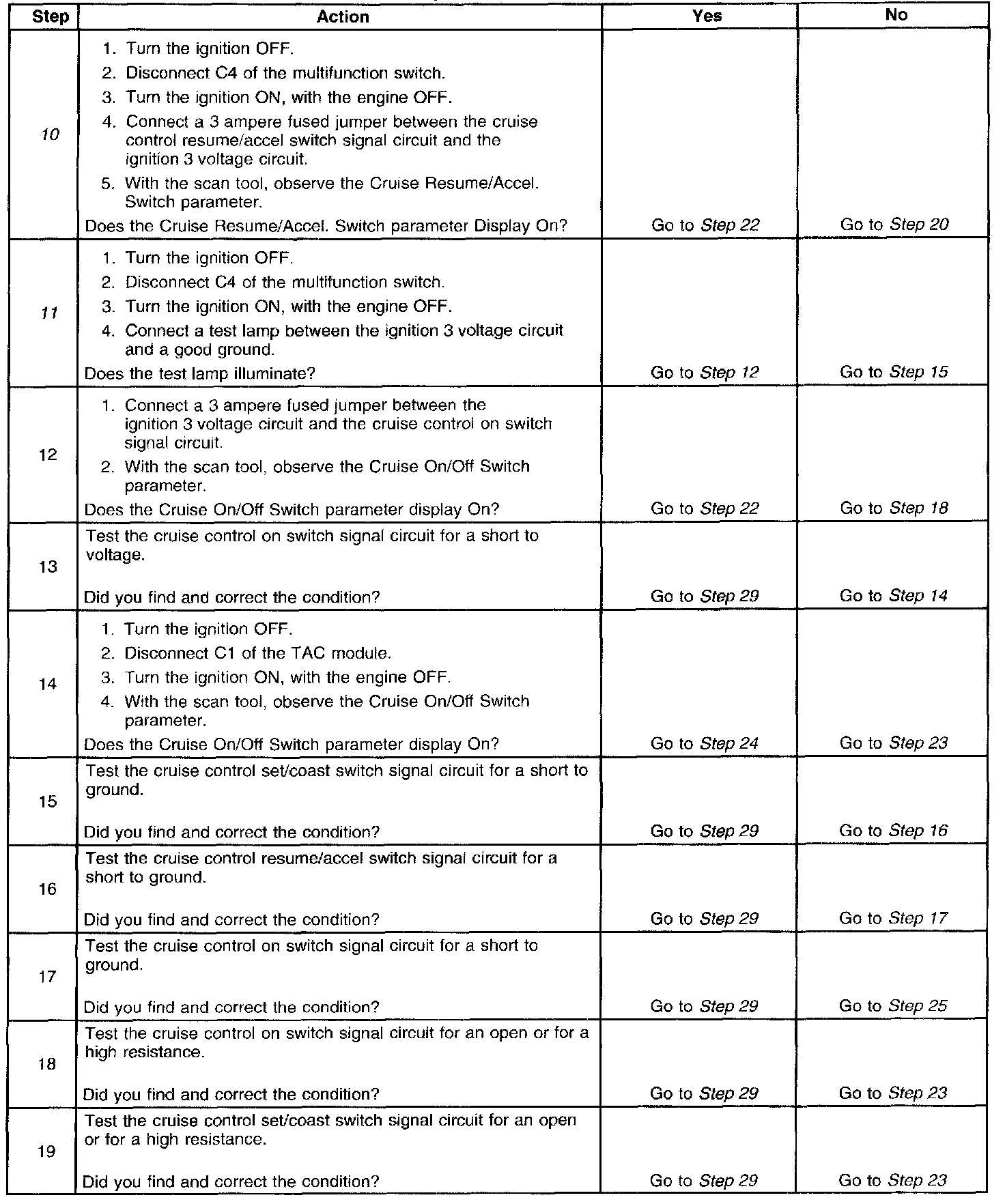 10. This step tests the cruise control resume/accel switch signal circuit for an open or for a high resistance.
