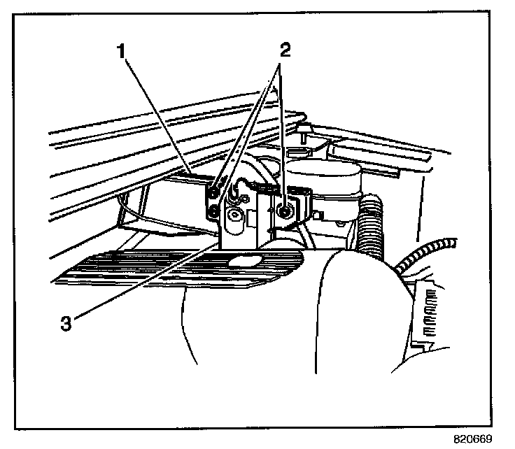 14. Remove the harness bracket nut (2) in order to remove the engine harness from the intake manifold.