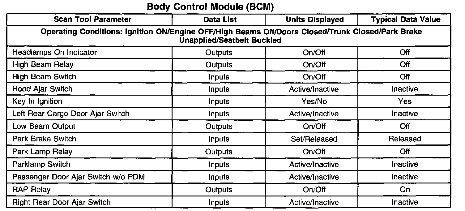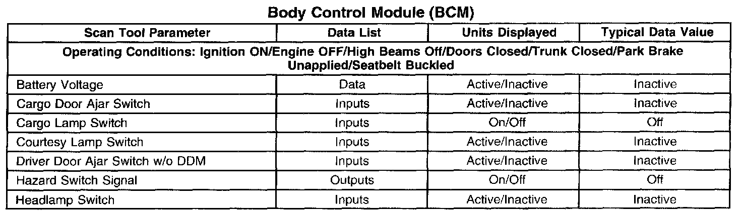 Scan Tool Data List - Body Control Module (BCM) Part 2: