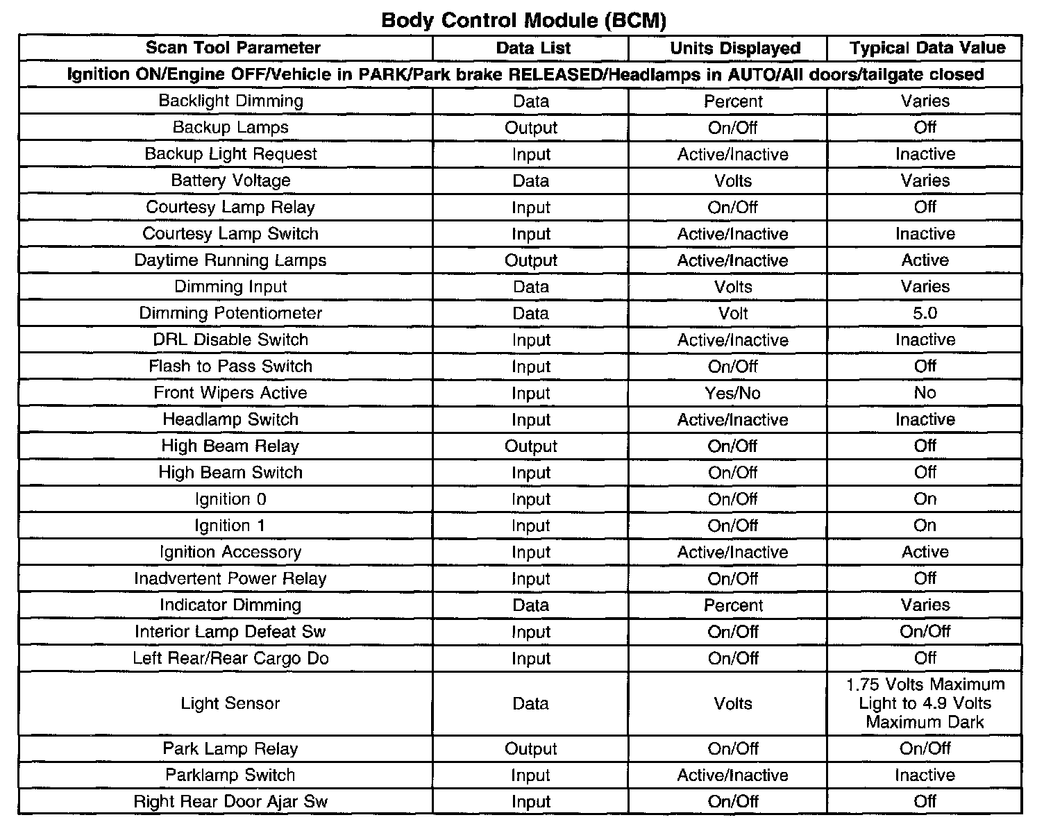 Scan Tool Data List - Body Control Module (BCM):