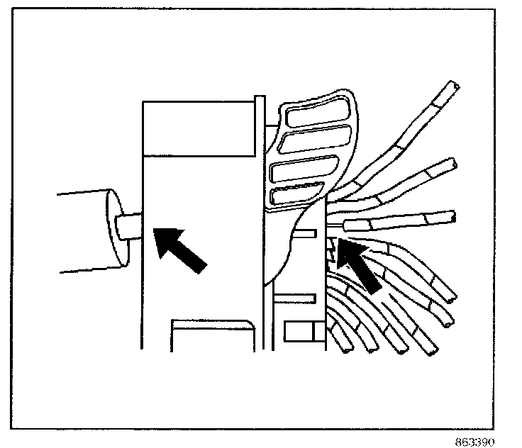 7. Insert the J 44020-4 (GM P/N 15314260) tool into the 2 triangular cavities on each side of the terminal at the front of the connector.