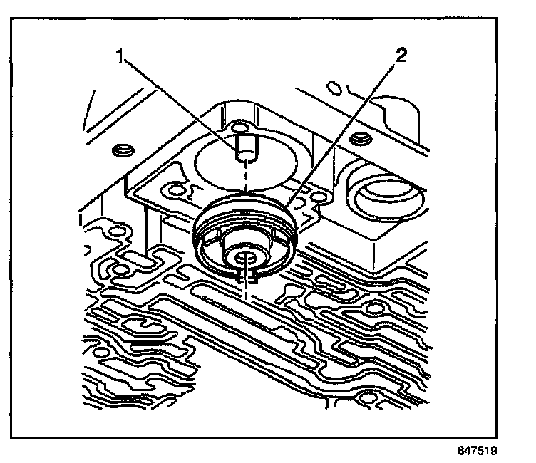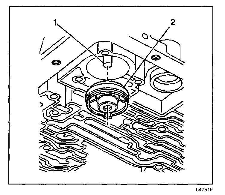 3. Install the 3-4 accumulator piston (2) onto the pin (1) in the transmission case.
