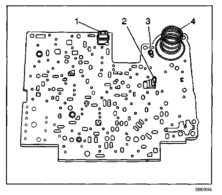 8. Place the 3-4 accumulator spring (4) on the spacer plate.