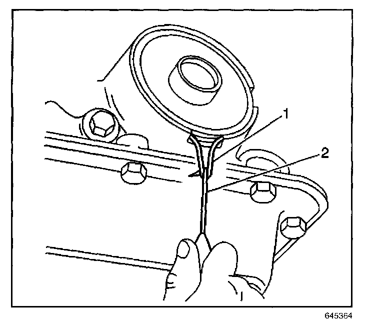 9. Remove the servo cover and the O-ring seal. If the cover is hung up on the seal, use a pick (2) to pull and stretch the seal (1) out of the groove. Cut and remove the O-ring seal before removing the cover.