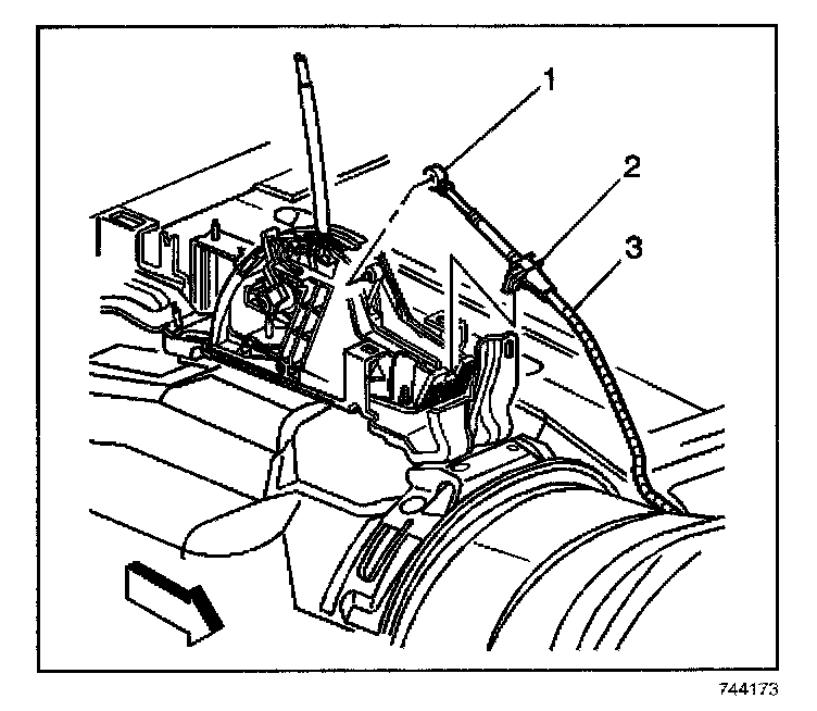 2. Remove the end of the range selector cable (1) from the transmission control ball stud