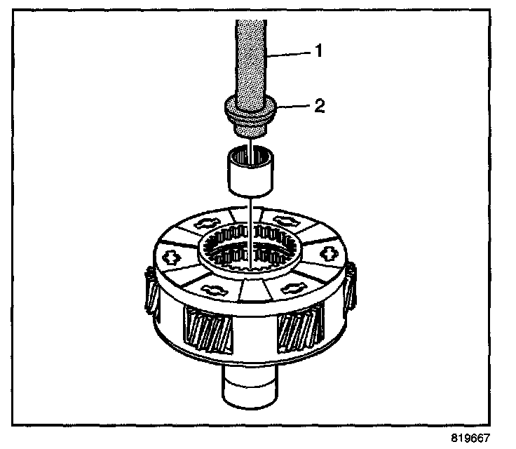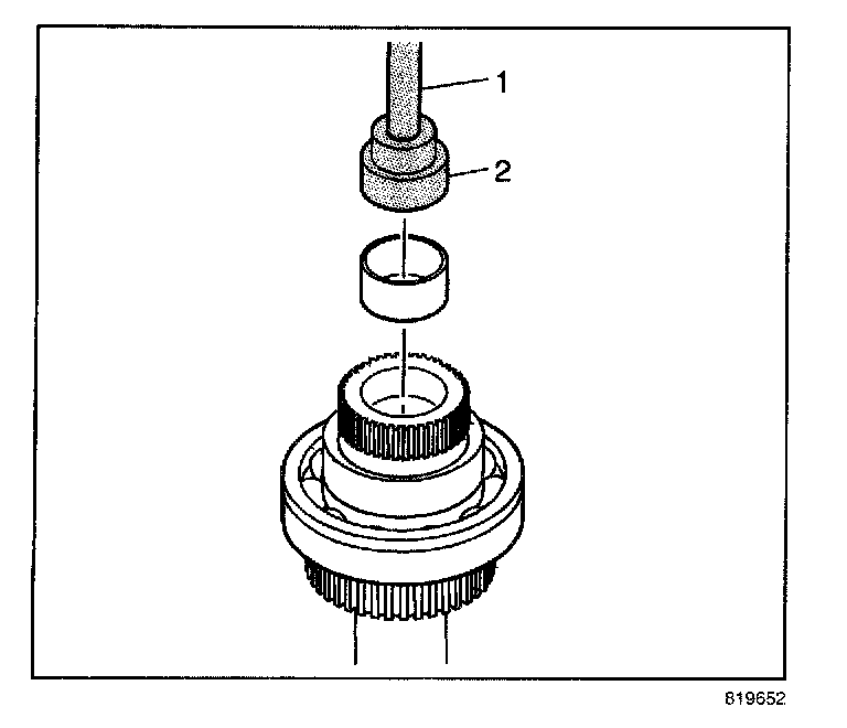 14. Using the J 42176 (1) and the J 45757 (2), install the mainshaft front support bearing in the high/low planetary carrier assembly.