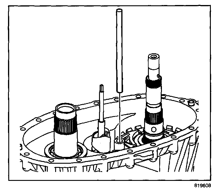 44. Rotate the rear output shaft three or four revolutions to rotate the planetary differential pinion gears. If properly aligned, the pinion gears will rotate freely, there will be no binding.