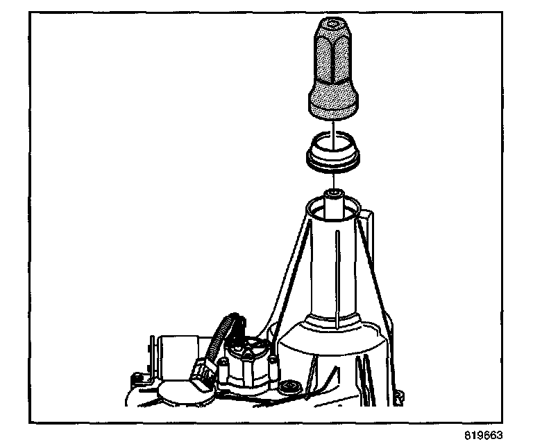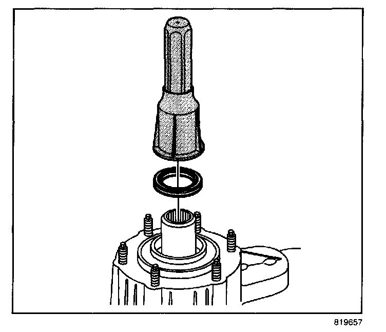 4. Install the seal for the shift detent lever shaft. The seal will install using hand pressure. The spring side, or opened side, of the seal faces outward.