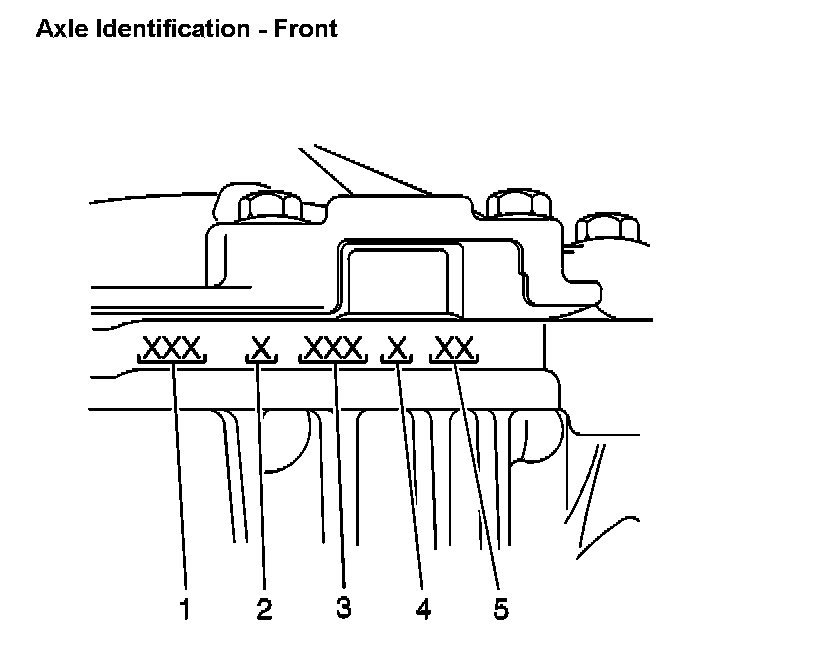 Front axle identification information is stamped on the top of the differential carrier assembly. The information includes the following: