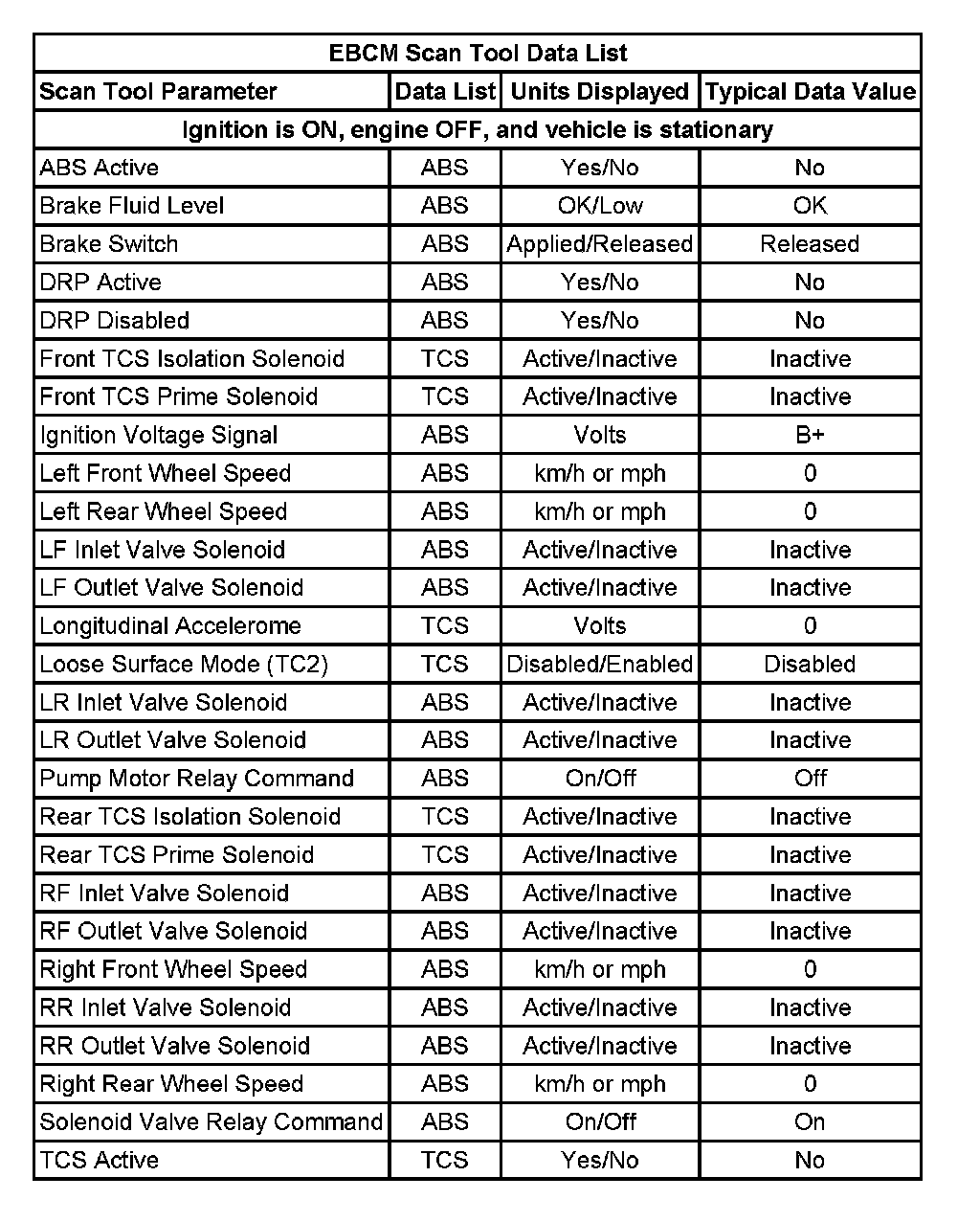 Use the EBCM Scan Tool Data Lists as directed by a diagnostic table or in order to supplement the diagnostic procedures. Begin all the diagnostic procedures with the ABS Diagnostic Starting Point. Use the EBCM Scan Tool Data Lists only after the following is determined: