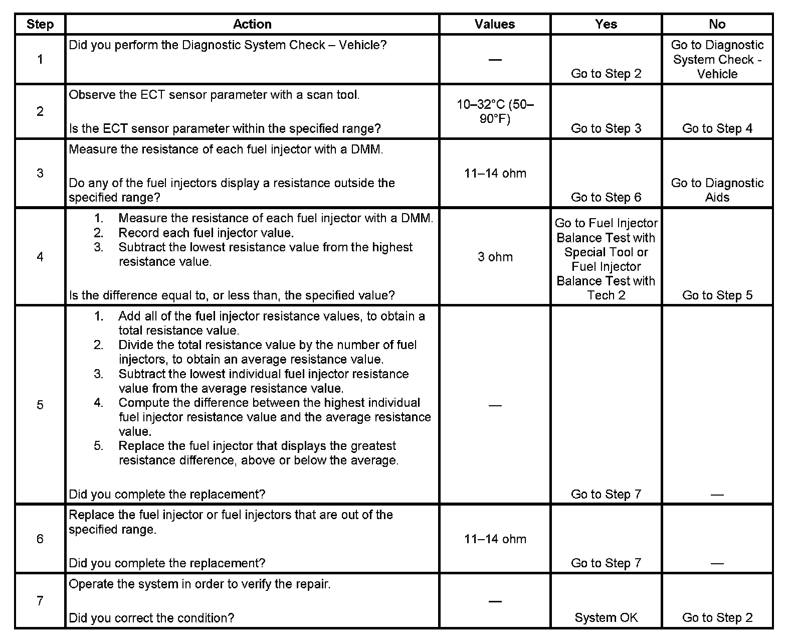 - If the fuel injector coil test does not isolate the condition perform the fuel injector balance test. Refer to Fuel Injector Balance Test with Special Tool or Fuel Injector Balance Test with Tech 2. Fuel Injector Balance Test With Special Tool Fuel Injector Balance Test With Tech 2
