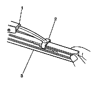 3. Engage the bottom claw (2) of the wiper blade (1) into the notches in wiper blade element (3).