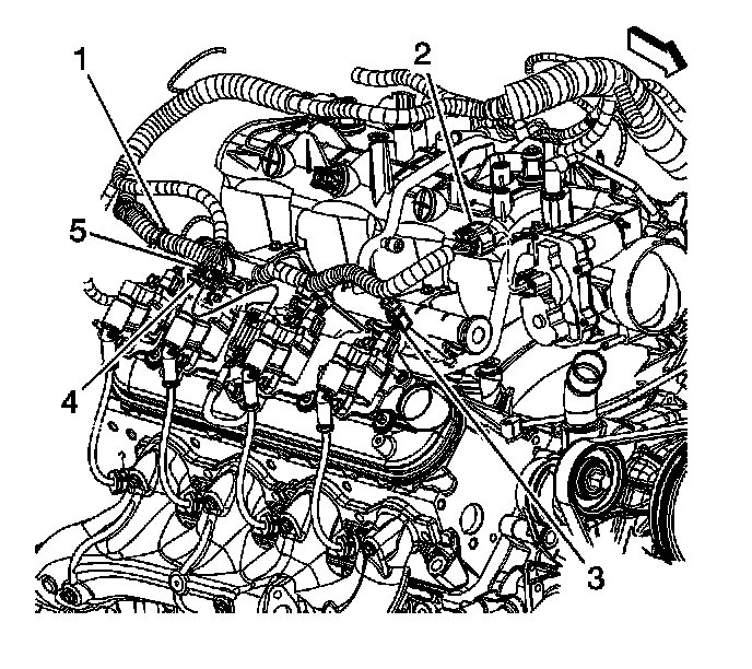 13. Remove the harness bracket nut (2) in order to remove the engine harness from the intake manifold.
