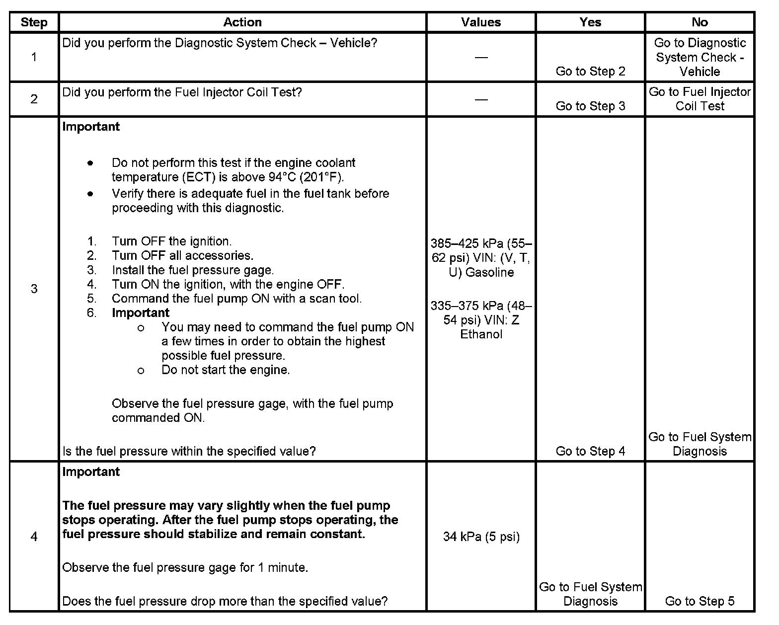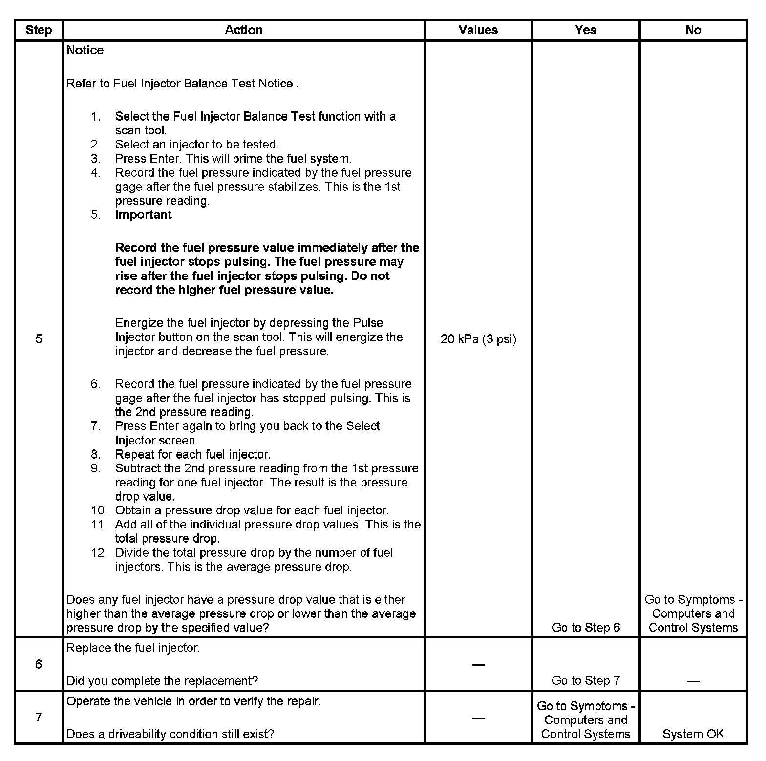 5. If the pressure drop value for each fuel injector is within 10 kPa (1.5 psi) of the average pressure drop value, the fuel injectors are flowing properly. Calculate the pressure drop value for each fuel injector by subtracting the second pressure reading from the first pressure reading.