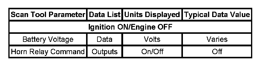 The Horns Scan Tool Data List contains all of the horn related parameters that are available on the scan tool. The parameters in the list are arranged in alphabetical order. The column, "Data List," indicates the location of the parameter within the scan tool menu selections. Use the Horns Scan Tool Data List as directed by a diagnostic table or in order to supplement the diagnostic procedures. Begin all of the diagnostic procedures with Diagnostic System Check - Vehicle. Diagnostic System Check - Vehicle