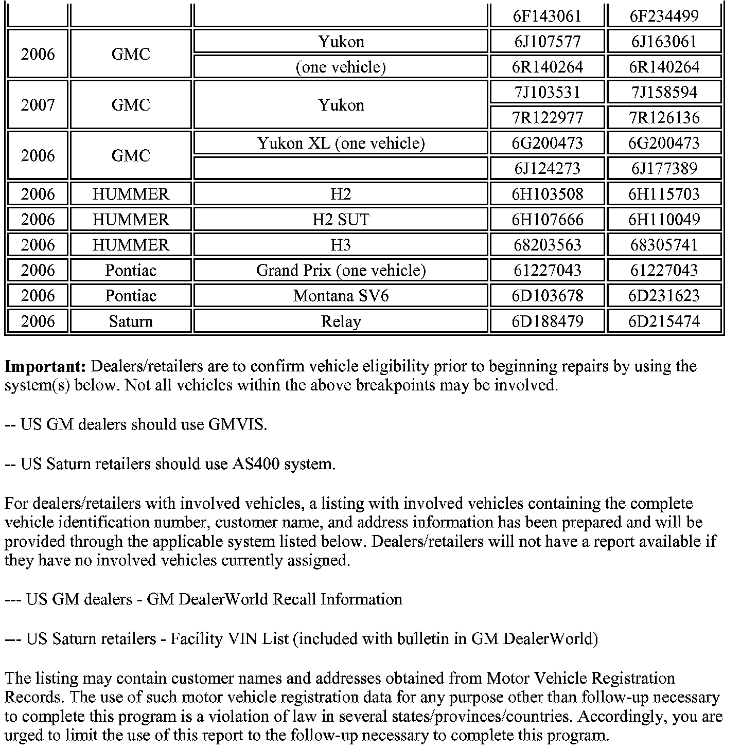 Some 2006 Buick Lucerne, Rainier, Rendezvous, Terraza; 2006 Cadillac CTS, DTS, Escalade, Escalade ESV, Escalade EXT, SRX, STS; 2007 Cadillac Escalade, Escalade ESV; 2006 Chevrolet Avalanche, Corvette, Malibu Maxx, Silverado, Suburban, Tahoe, TrailBlazer, TrailBlazer EXT, Uplander; 2007 Chevrolet Avalanche, Suburban, Tahoe; 2006 GMC Envoy, Envoy XL, Sierra, Yukon, Yukon XL; 2007 GMC Yukon; 2006 HUMMER H2, H2 SUT, H3; 2006 Pontiac Grand Prix, Montana SV6; and 2006 Saturn Relay vehicles may have a condition in which the Mercury Disposal Notice Label was not included on the vehicle. This label contains instructions for the proper disposal of mercury-containing components installed on the vehicle.