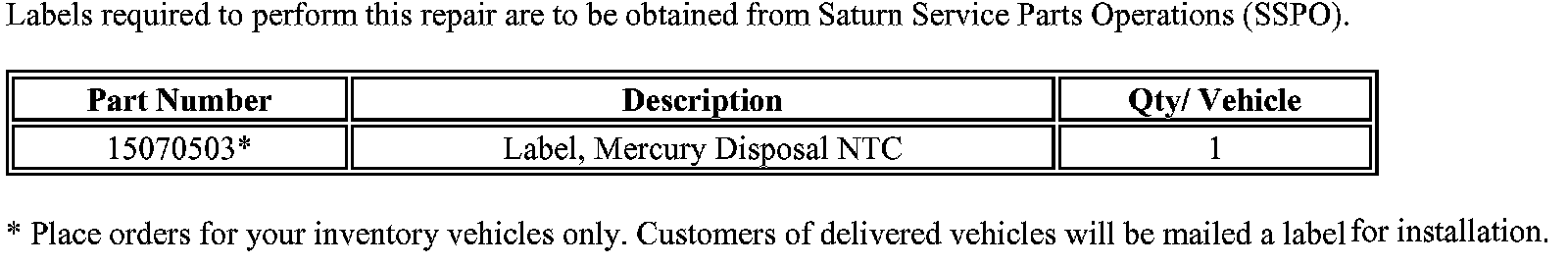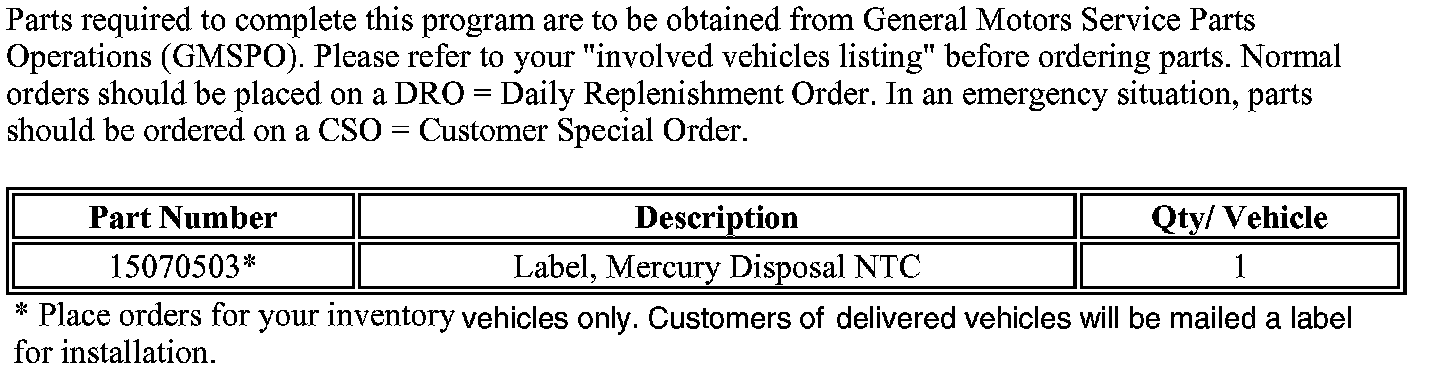 Dealers/Retailers are to install a Mercury Disposal Notice Label on the driver's side door post. Since this label can easily be installed by the customer, and to reduce their inconvenience, labels and installation instructions will be mailed to customers of record. This program will expire on August 31, 2006.