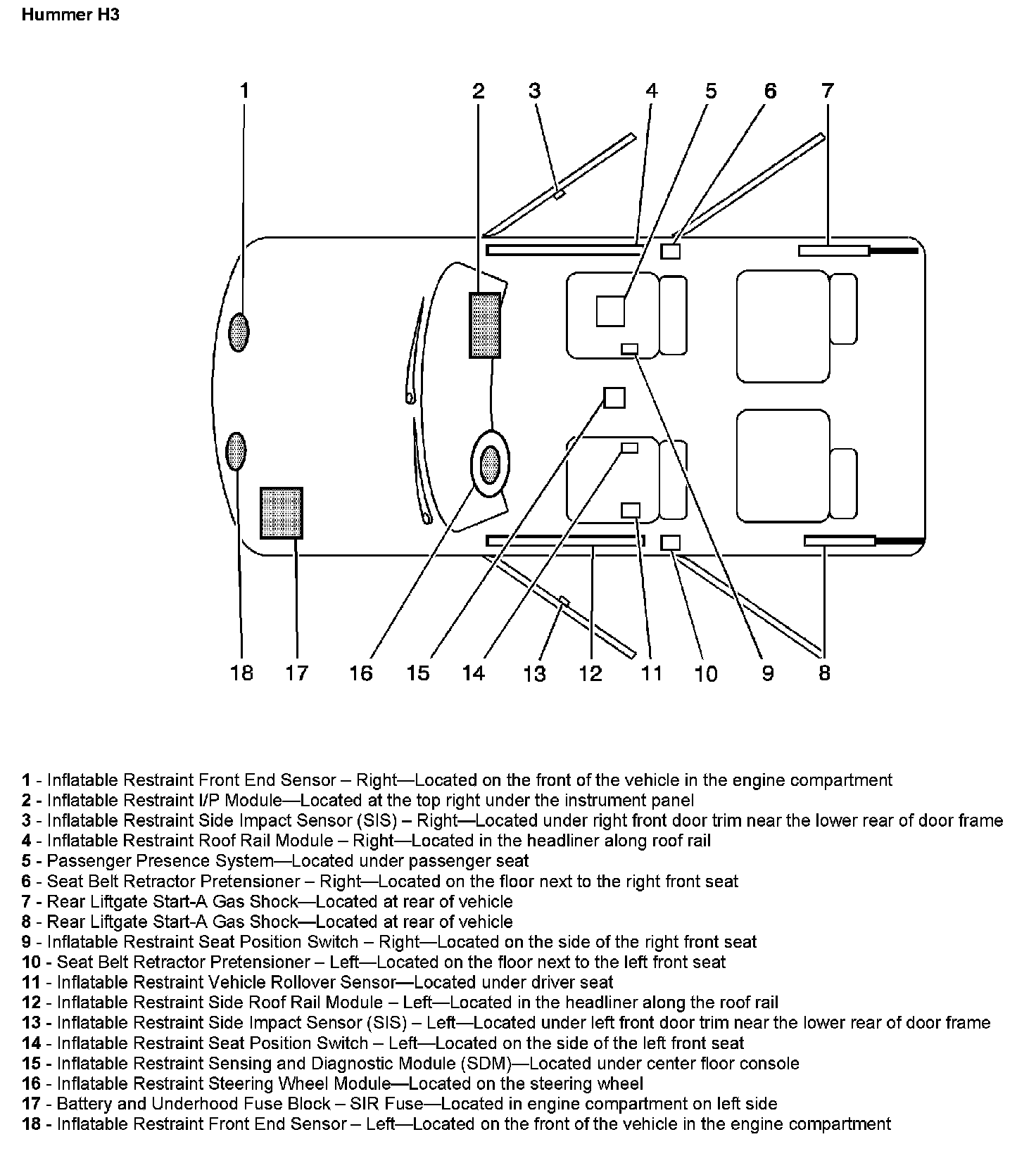 The SIR Zone Identification Views shown illustrate the approximate location of all SIR components available for the vehicle. This will assist in determining the appropriate SIR Disabling and Enabling Zones for a given service procedure, refer to SIR Disabling and Enabling Zones.