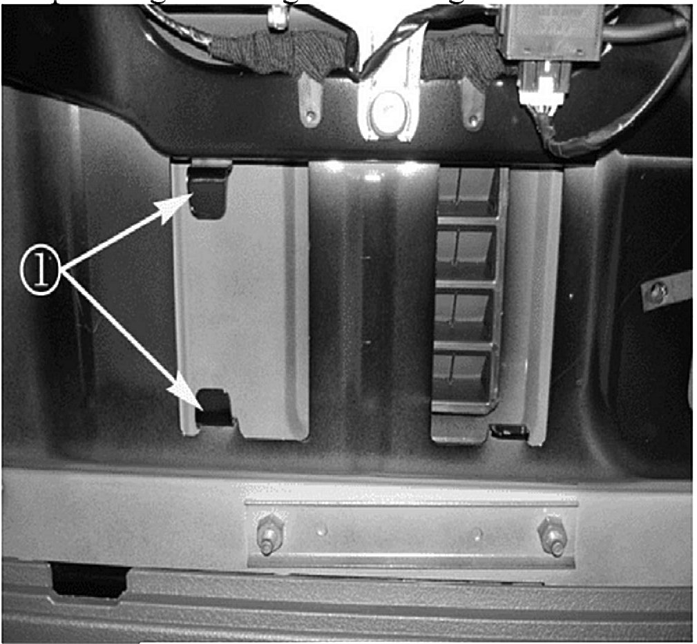 8. Position the jack and jack tool bag in the swing-gate. When reinstalling the jack and jack tool bag, make sure the jack base is securely seated behind (2) the tabs (1) in the swing-gate.