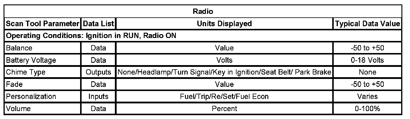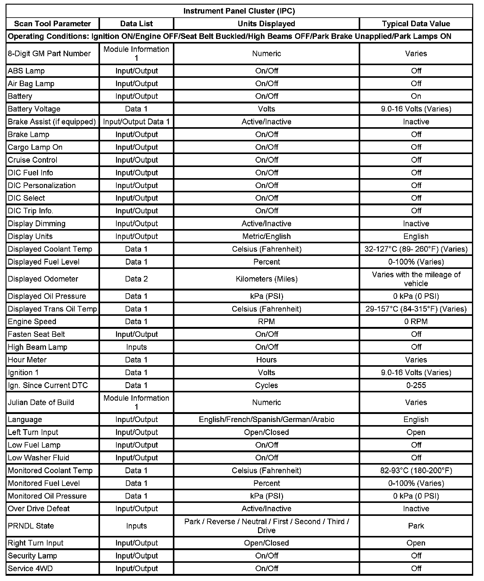 The typical data values are obtained from a properly operating vehicle under the conditions specified in the first row of the scan tool data list table. Comparison of the parameter values from the suspect vehicle with the typical data values may reveal the source of the customer concern.