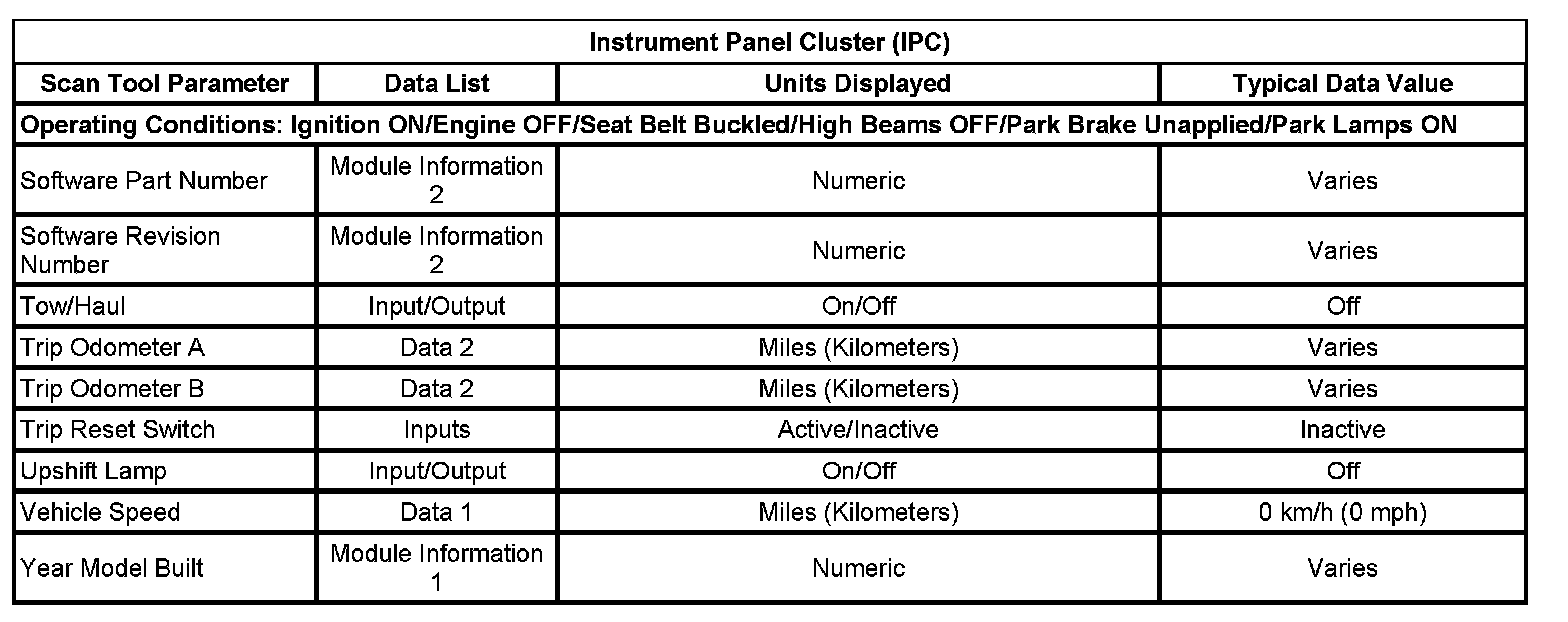 The scan tool data lists contain all the instrument panel, gages, and console related parameters that are available on the scan tool. The parameters in the list are arranged in alphabetical order. The data list column indicates the location of the parameter within the scan tool menu selections.