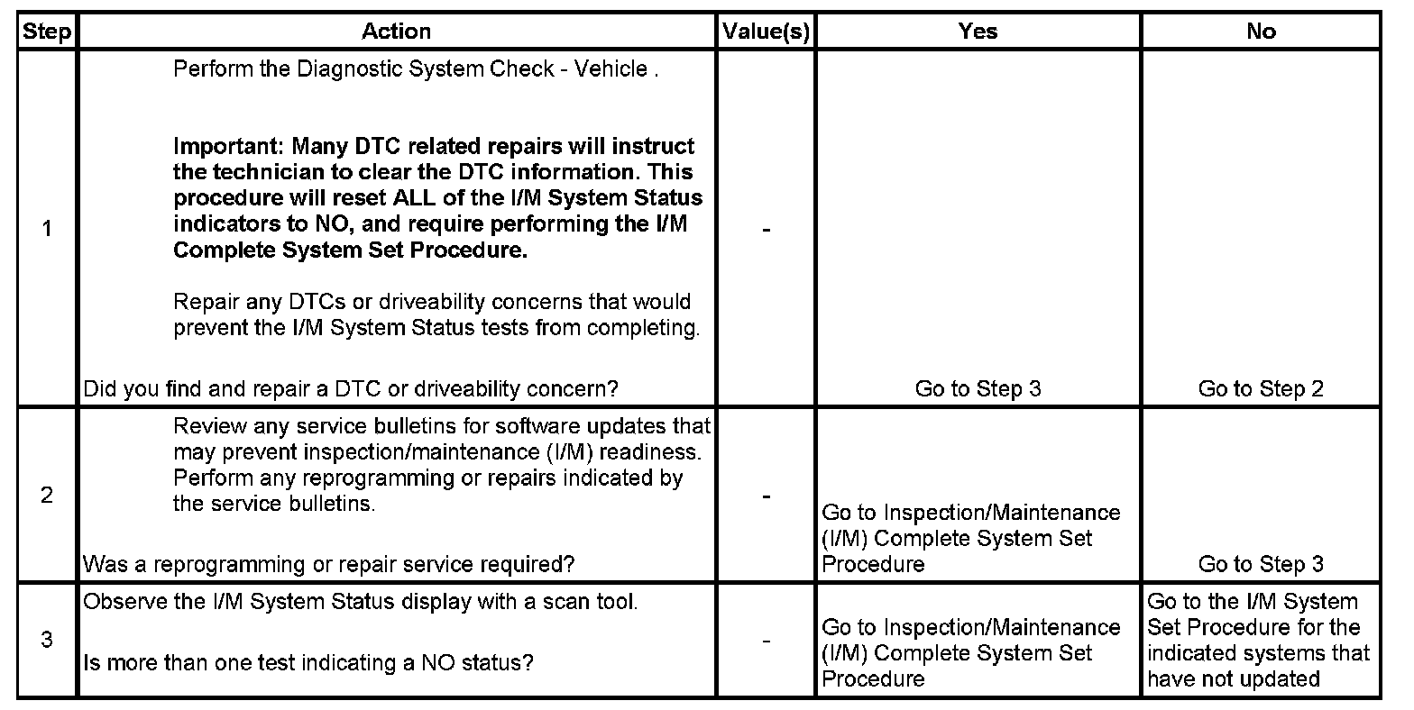 For the specific DTCs required for each system, refer to Inspection/Maintenance (I/M) System DTC Table. Systems such as fuel delivery, misfire, and comprehensive components may not be listed in a system status list. These tests run continuously and do not require an I/M System Status indicator. Inspection/Maintenance (I/M) System DTC Table