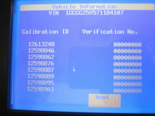 8. Take a CLEAR digital picture of the Tech 2(R) Vehicle Information screen showing the engine Calibration IDs and Verification Numbers as shown above. Retain the printout information and the Tech 2(R) screen photograph with the repair order.
