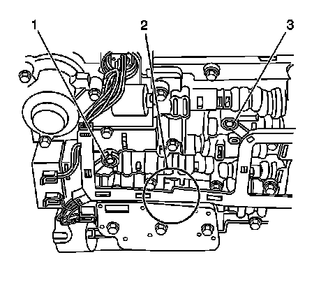 15. Place the tab between the valve body and the pressure switch in the location shown (2). Press the harness into position on the valve body bolt bosses (1, 3).