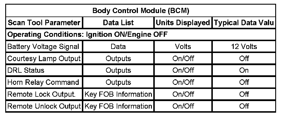 The Keyless Entry Scan Tool Data List contains all of the keyless entry related parameters that are available on the scan tool. The parameters in the list are arranged in alphabetical order. The column, "Data List," indicates the location of the parameter within the scan tool menu selections. Use the Keyless Entry Scan Tool Data List as directed by a diagnostic table or in order to supplement the diagnostic procedures. Begin all of the diagnostic procedures with Diagnostic System Check - Vehicle. Diagnostic System Check - Vehicle