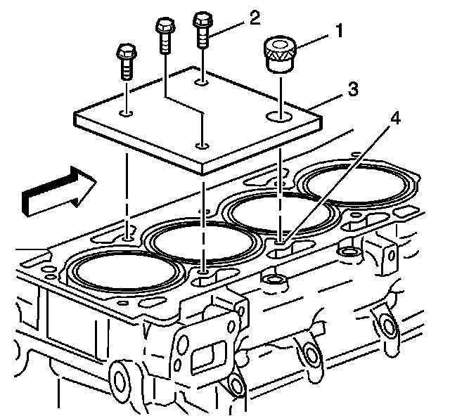 1. Position the fixture plate (3) with the bushing (1) installed over the cylinder head bolt hole to be repaired (4).