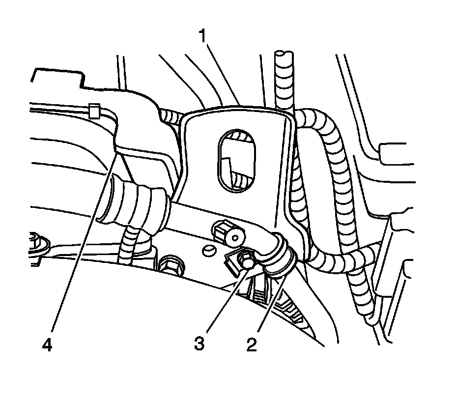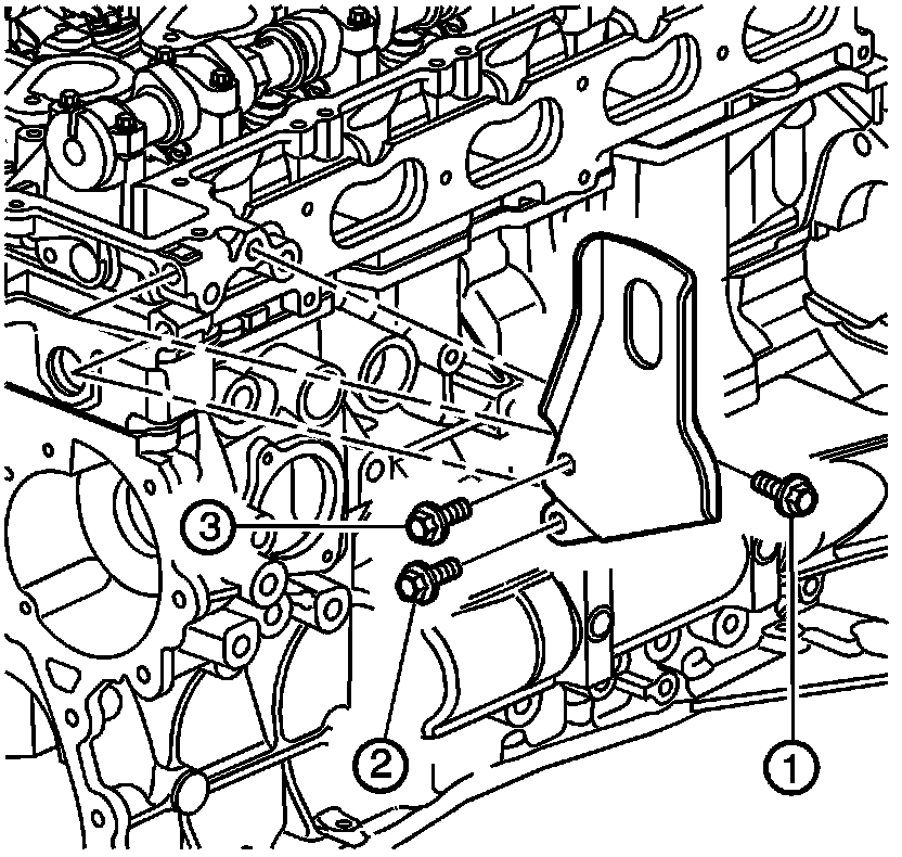 2. Remove the bolt (3) securing the A/C compressor hose/pipe bracket (2) to the engine lift bracket (1).