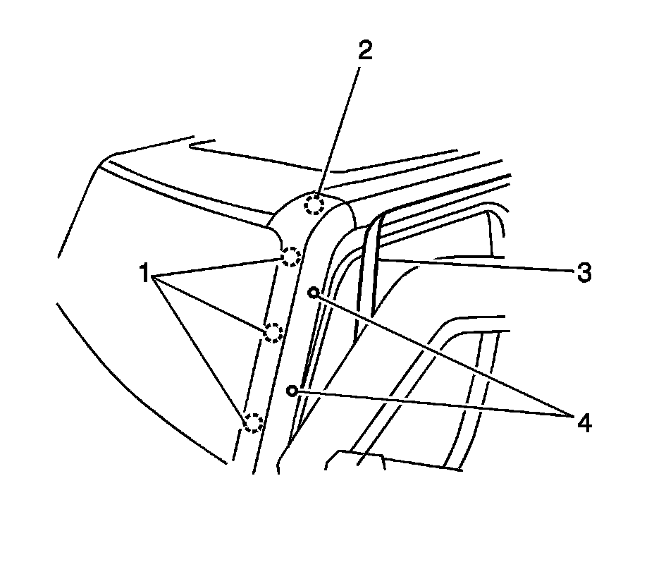 18. Remove the exterior trim on both driver and passenger A-pillars by first peeling back the weatherstrip (3) to expose 2 screws (4).