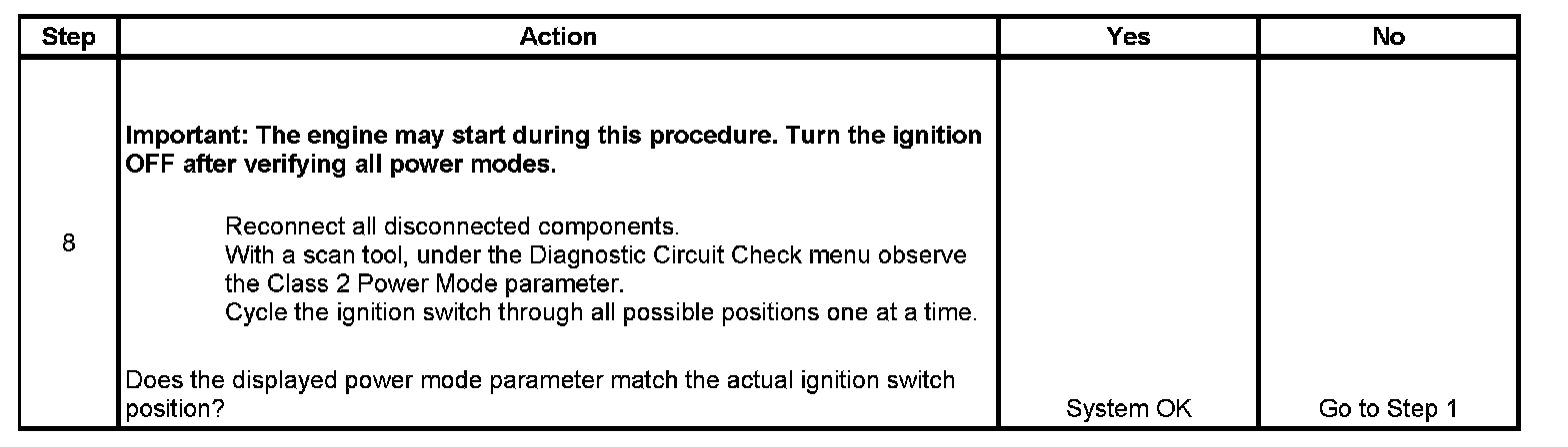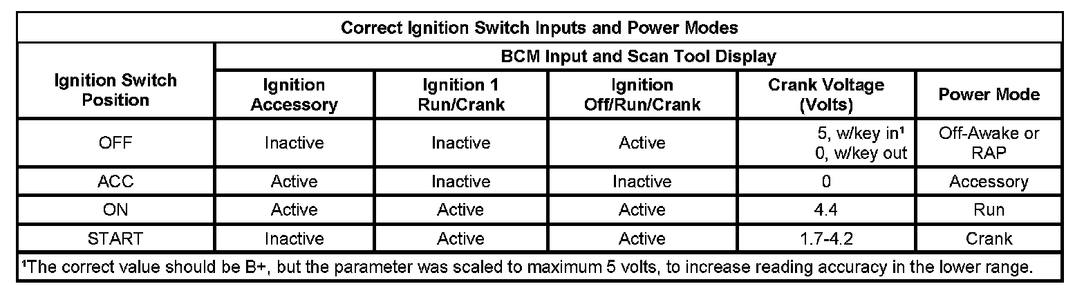 The body control module (BCM) monitors the ignition inputs Ignition Off/Run/Crank, Ignition 1 Run/Crank and the Ignition Accessory signals supplied from the ignition switch. The BCM uses the sequence that the signals appear, their voltage levels and the engine run flag (ERF) status to determine the power mode. Battery voltage is supplied to the ignition switch by the IGN TRANSD fuse. The ignition key resistor signal from the BCM provides a 5-volt supply voltage to the ignition switch. The table below shows the correct ignition switch inputs and power modes.