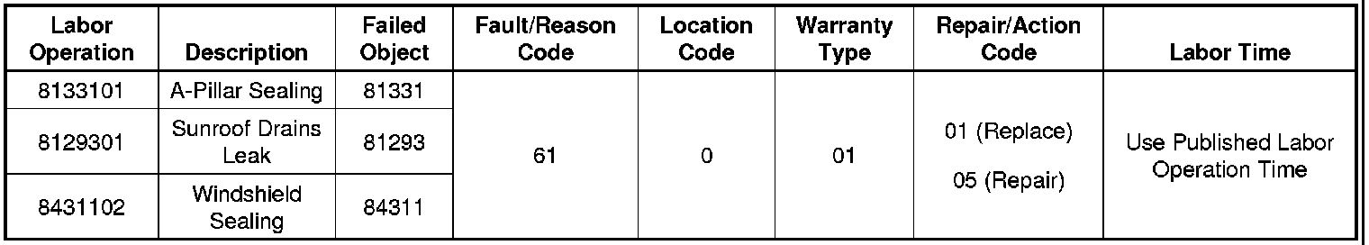 For vehicles repaired under warranty, use the appropriate labor operation for the source of the water leak