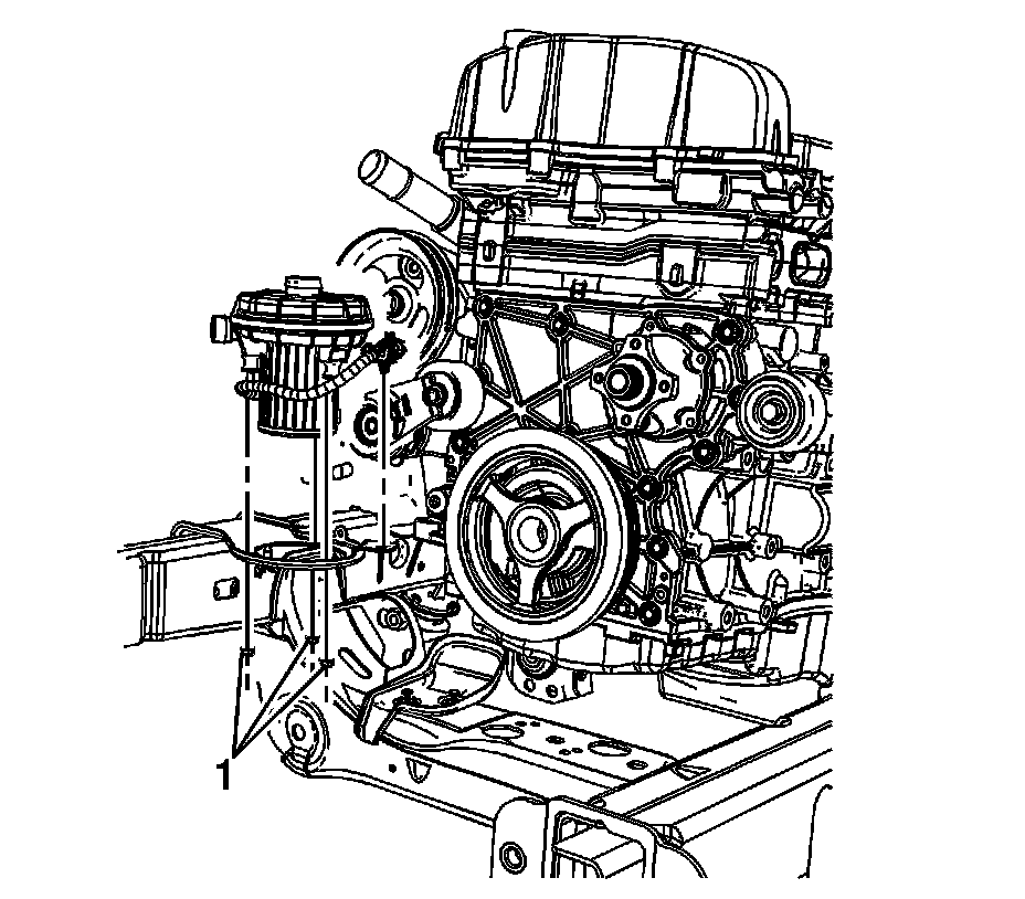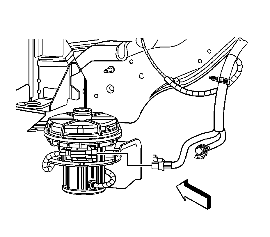 2. From under the hood, disconnect the secondary air injection (AIR) pump inlet hose quick connect fitting (1) from the pump. Refer to Plastic Collar Quick Connect Fitting Service.